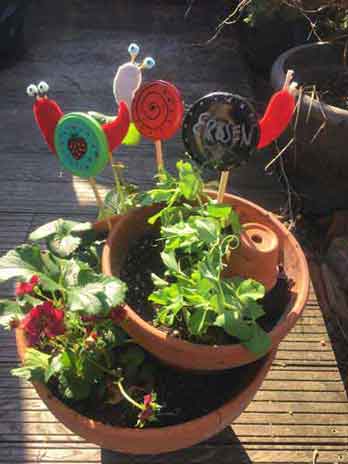 Für die Fensterbank oder den Balkon könnt Ihr Euch einen Topfgarten mit dem liebsten Gemüse bauen. Wir haben Erbsen und Erdbeeren in ihren Töpfen gestapelt. Sind die im Sommer abgeerntet, könnt Ihr die Töpfe neu bepflanzen und im Herbst z. B. ein paar Blumenzwiebeln fürs Frühjahr versenken. Gut geeignet ist alles, was nicht so hoch wächst, dafür aber lecker ist: Cocktailtomaten, Radieschen, Salat, essbare Blumen wie Ringelblumen, Gänseblümchen, Rosen oder Stiefmütterchen. Ihr könnt aus bemalten Deckeln und Filz oder Moosgummi noch lustige Schnecken basteln, die Euch verraten, was Ihr in Euren Minibeeten gesät habt.