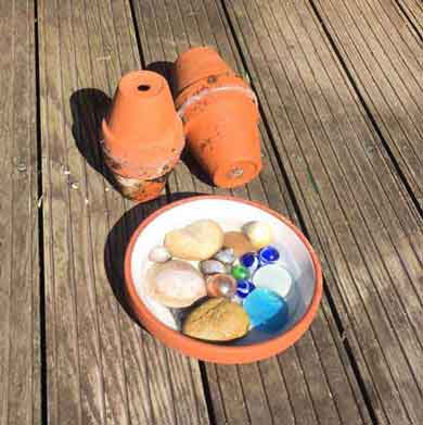 Nicht nur Eure Pflanzen brauchen Wasser, sondern auch all die Bienen, Hummeln und Schmetterlinge. Ihnen könnt Ihr ganz einfach eine Wasserstelle bauen, an der Ihr sie auch prima beobachten könnt. Dafür eine Schale mit kleinen Steinen, Murmeln, Zapfen, Muscheln oder Ähnlichem auslegen und etwas Wasser einfüllen. So können die Insekten sicher landen und ertrinken nicht. Bitte regelmäßig den Wasserstand checken und säubern.